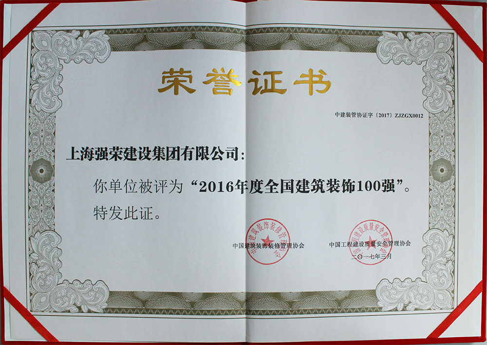 集团公司被评为“2016年度全国建筑装饰100强”
