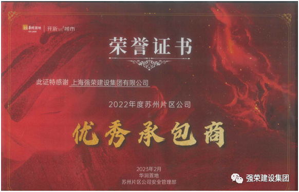 2023年2月,集团公司荣获华润置地颁发的2022年度苏州片区公司优秀承包商荣誉证书。