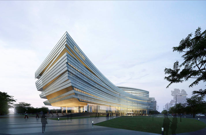 本工程为双层幕墙,内层为明框玻璃幕墙,外层为悬挑的镂空铝板幕墙,通过明装钢结构和镂空铝板幕墙塑造了一艘即将远航的“巨轮”。